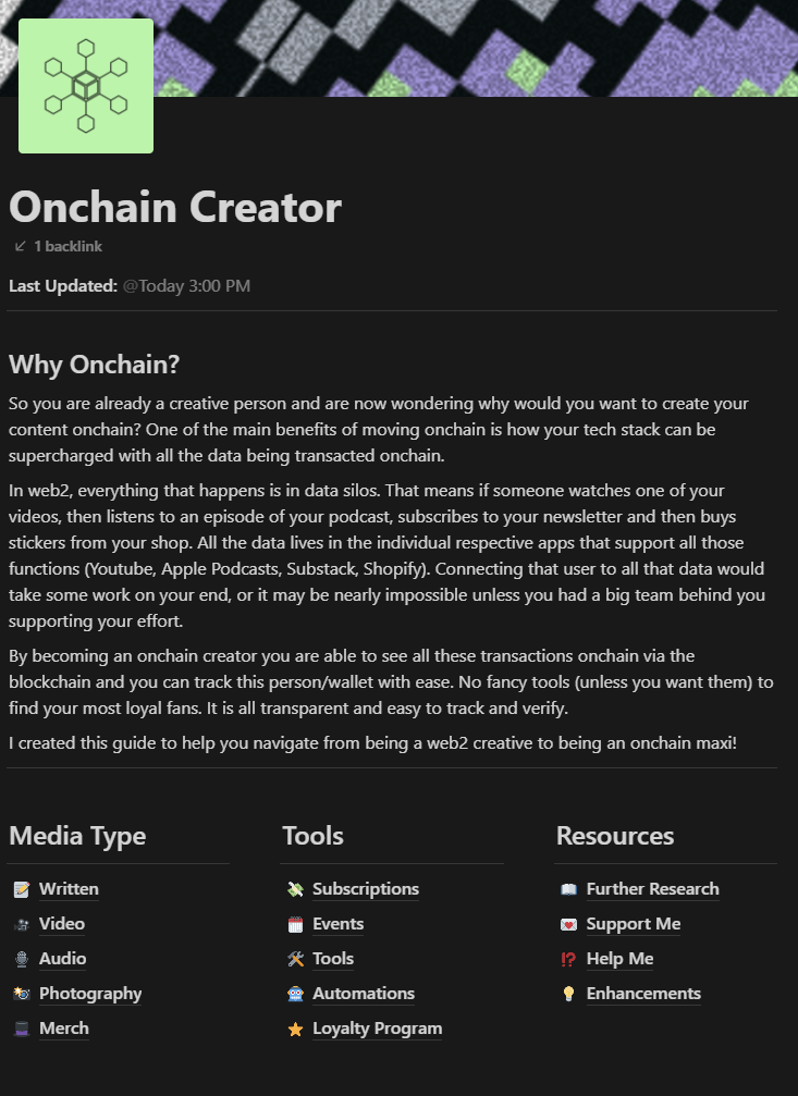 Unlock Your Creative Potential: Dive into the World of OnChain Creation! 🚀 Ready to harness the power of blockchain technology and unleash your creativity? This comprehensive guide covers everything you need to know to become a top-tier onchain creator. From crafting captivating audio, engaging written content, and visually stunning videos, to designing irresistible merch, we've got you covered. Explore the tools, tips, and strategies to thrive in this exciting digital landscape. Whether you're a seasoned creator or just starting out, this guide will equip you with the knowledge and skills to make your mark in the world of onchain creativity. Get ready to elevate your content and join the revolution today!